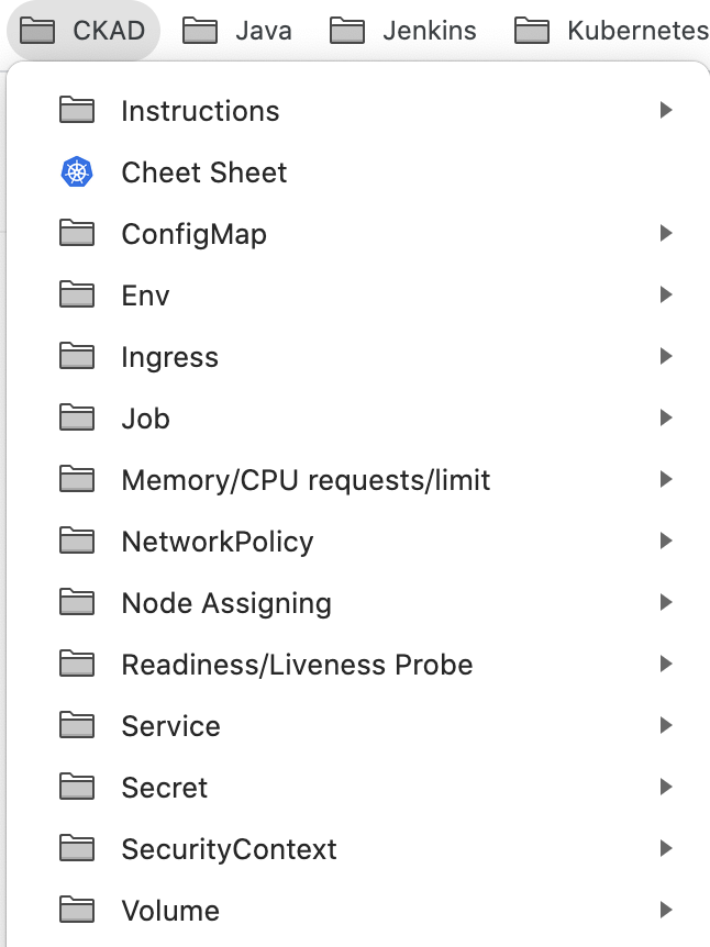 각각의 주제에 대하여, 바로바로 찾아볼 수 있는 yml 파일에 대한 링크를 정리해두었다. 예를 들어, secret에 대한 yml 파일, secret을 volume mount하는 yml 파일 등은 따로 링크를 만들어 Secret이라는 디렉토리 아래에 정리해두었다. 추가로 연습문제를 풀면서 내가 빠뜨린 내용이 있는지 확인하고 북마크를 채워나갔다. 이렇게 정리를 해두고 시작하니, 시험 도중 검색을 할 일이 거의 없었고, 빠르게 필요한 내용을 찾으면서 문제를 풀 수 있었다.