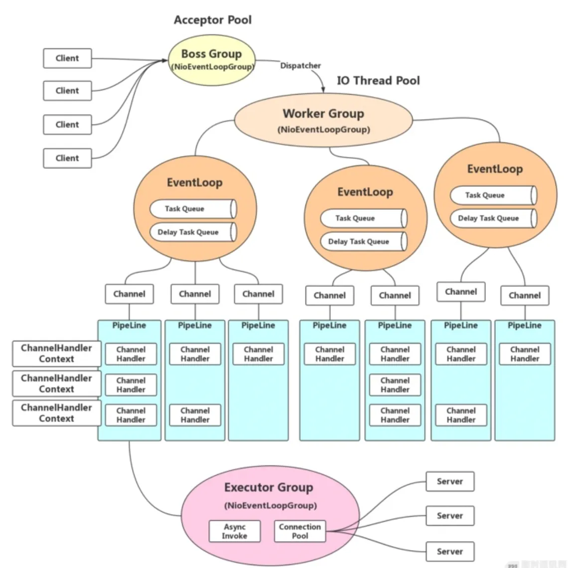 각 이벤트루프는 1개의 스레드 + 1개의 Selector + 1개의 TaskQueue로 이루어진다. 연결 요청의 결과로 생성된 채널은 특정 이벤트루프에 등록되며, 이후 해당 이벤트루프가 그 채널에 대한 모든 이벤트(Read, Write 등)를 처리한다. Selector는 등록된 채널 중에서 이벤트가 발생하여 처리 가능한 상태인 채널을 감지하고 반환하며, 이벤트루프는 해당 채널의 ChannelPipeline에 등록된 Handler들을 순차적으로 실행하여 이벤트를 처리한다. 이벤트 처리 중 추가적인 비동기 작업(ex. 콜백)이 필요할 경우, TaskQueue에 작업이 등록되며, 이벤트루프는 I/O 이벤트를 처리한 후 TaskQueue의 작업을 꺼내와 실행한다.